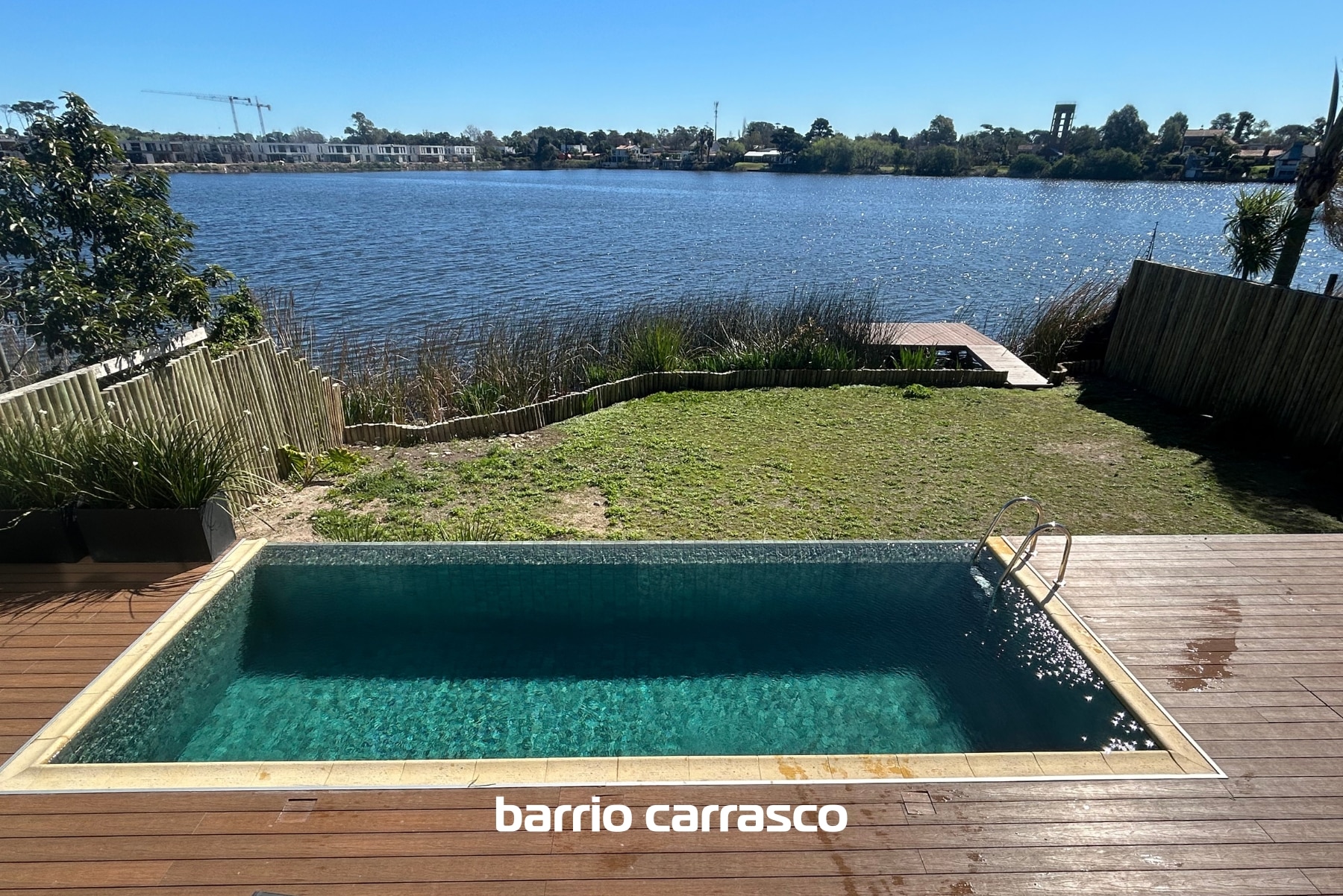 El área social integra piscina con deck, solarium y muelle directamente vinculado al lago.