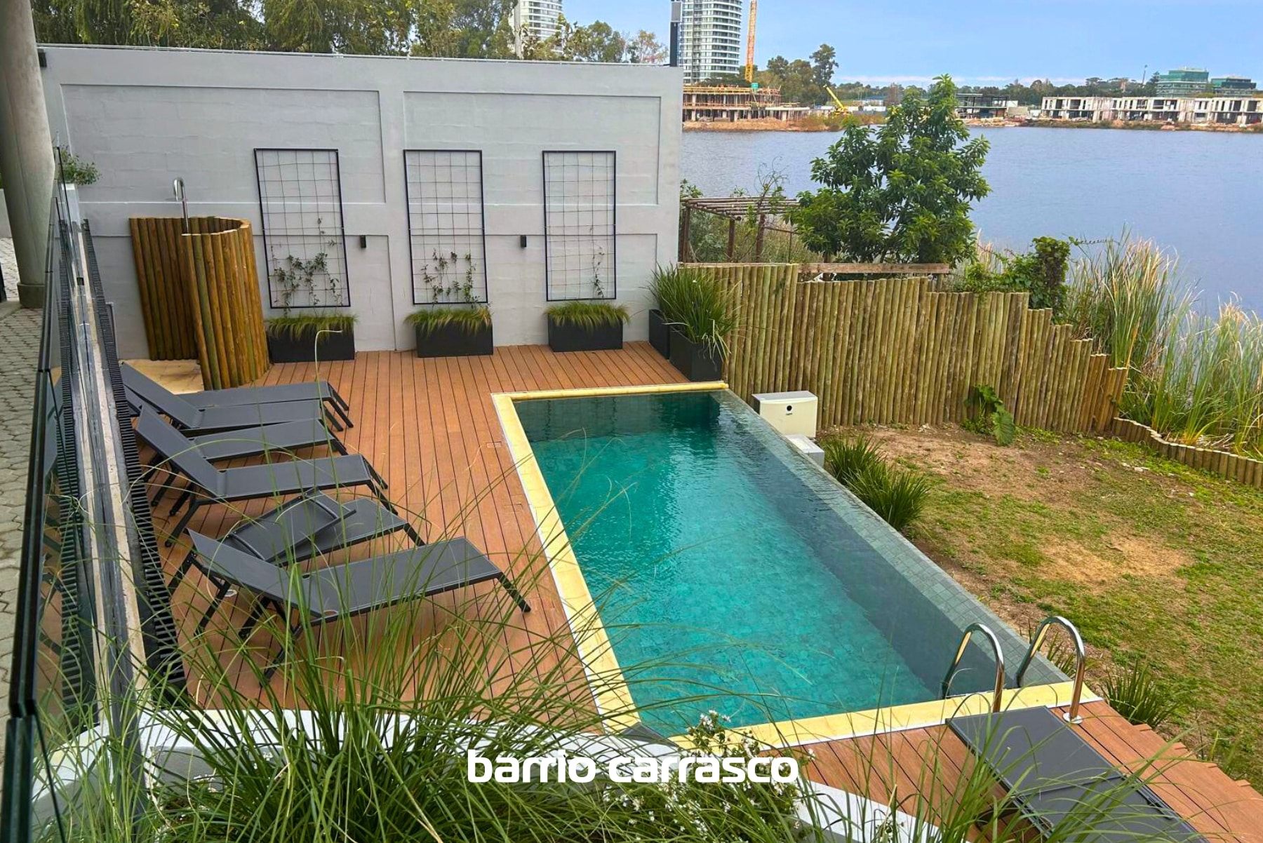 Piscina con deck, reposeras, sombrillas y duchero exterior