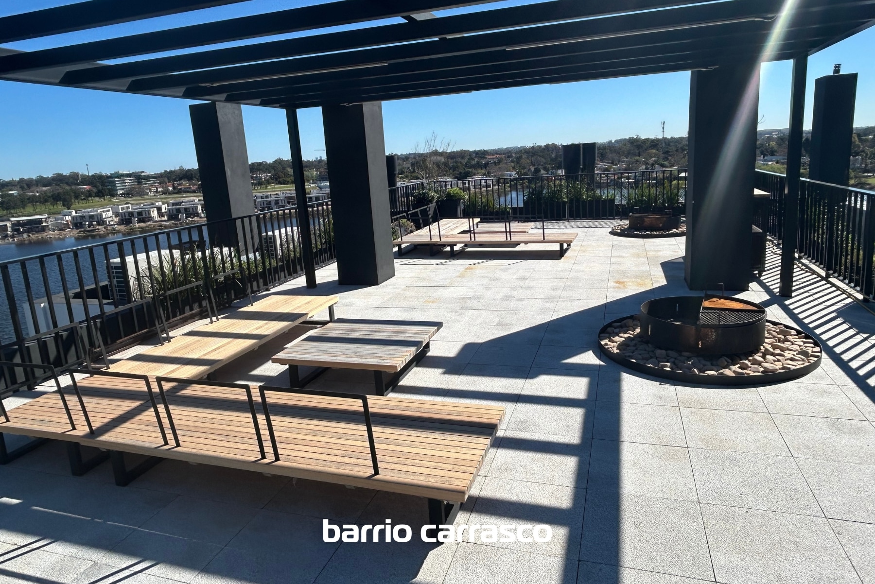 Rooftop con barra móvil, livings, fire pits y vistas amplias