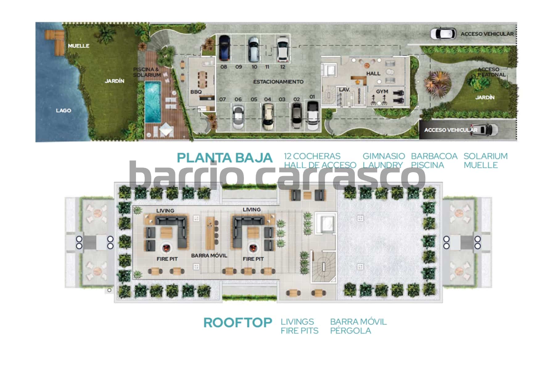 El edificio incorpora piscina con solarium, deck con reposeras, sombrillas y duchero, plataforma flotante para acceder al lago, barbacoa completa con terraza, gimnasio, laundry, rooftop con barra móvil, livings, fire pits, además de muelle, jardines, cocheras y seguridad.