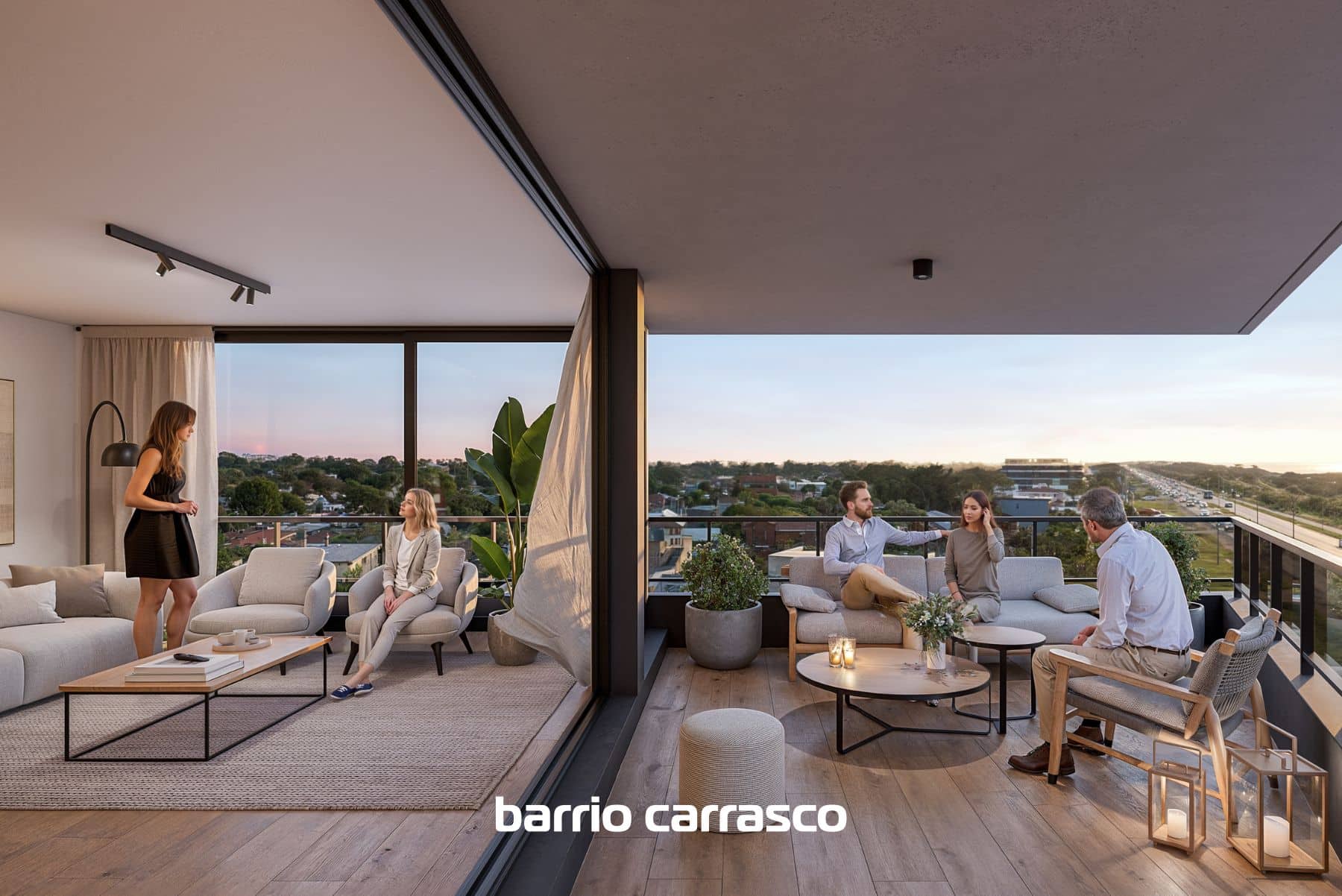 Las imágenes del proyecto muestran la fachada contemporánea hacia la rambla, interiores luminosos con grandes ventanales, terrazas verdes orientadas al mar y vistas al barrio de Parque Carrasco.