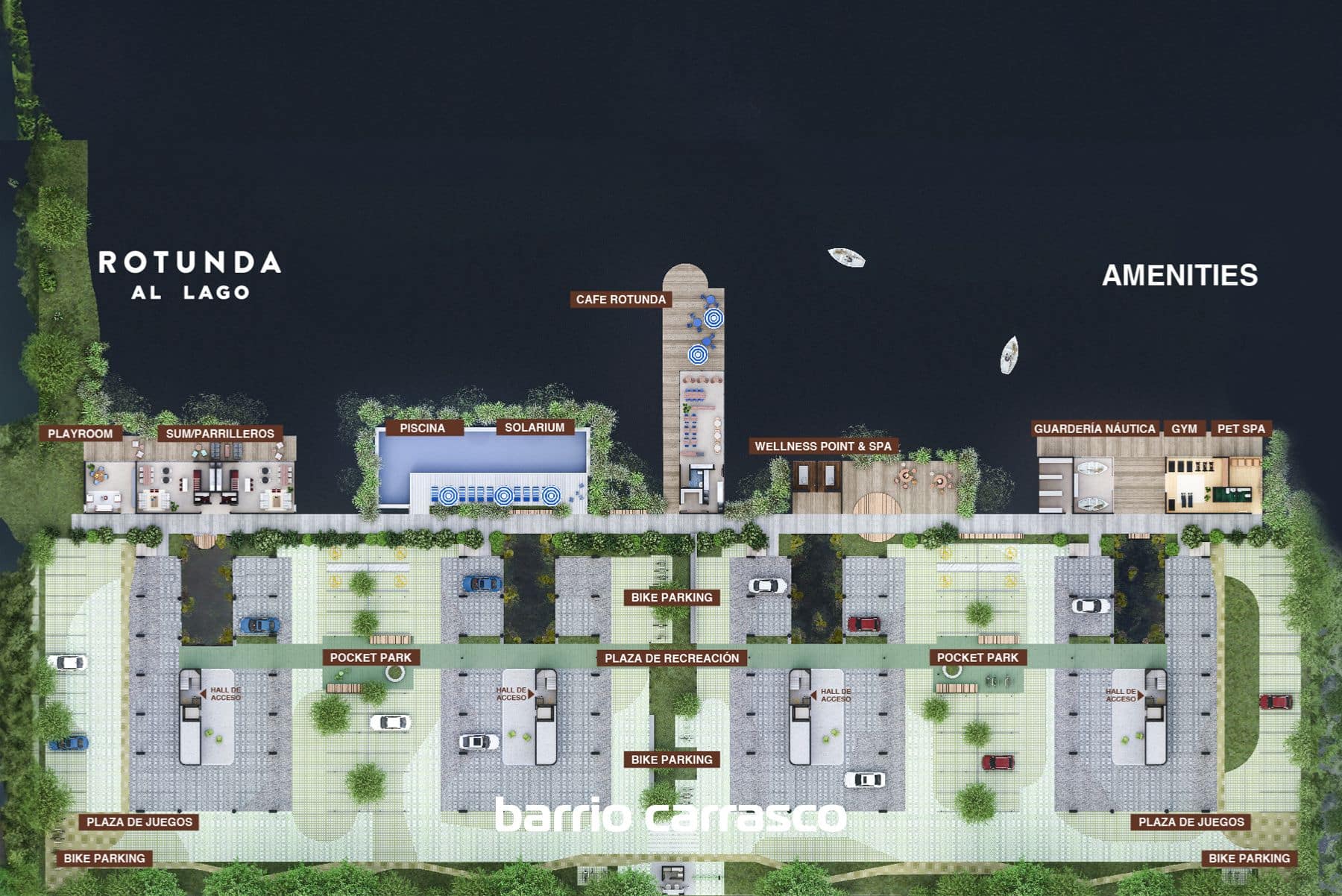 Rotunda al Lago se inserta en Ciudad de la Costa, entre lagos y el Río de la Plata, próximo al Aeropuerto de Carrasco, Parque Roosevelt y avenidas de conexión.