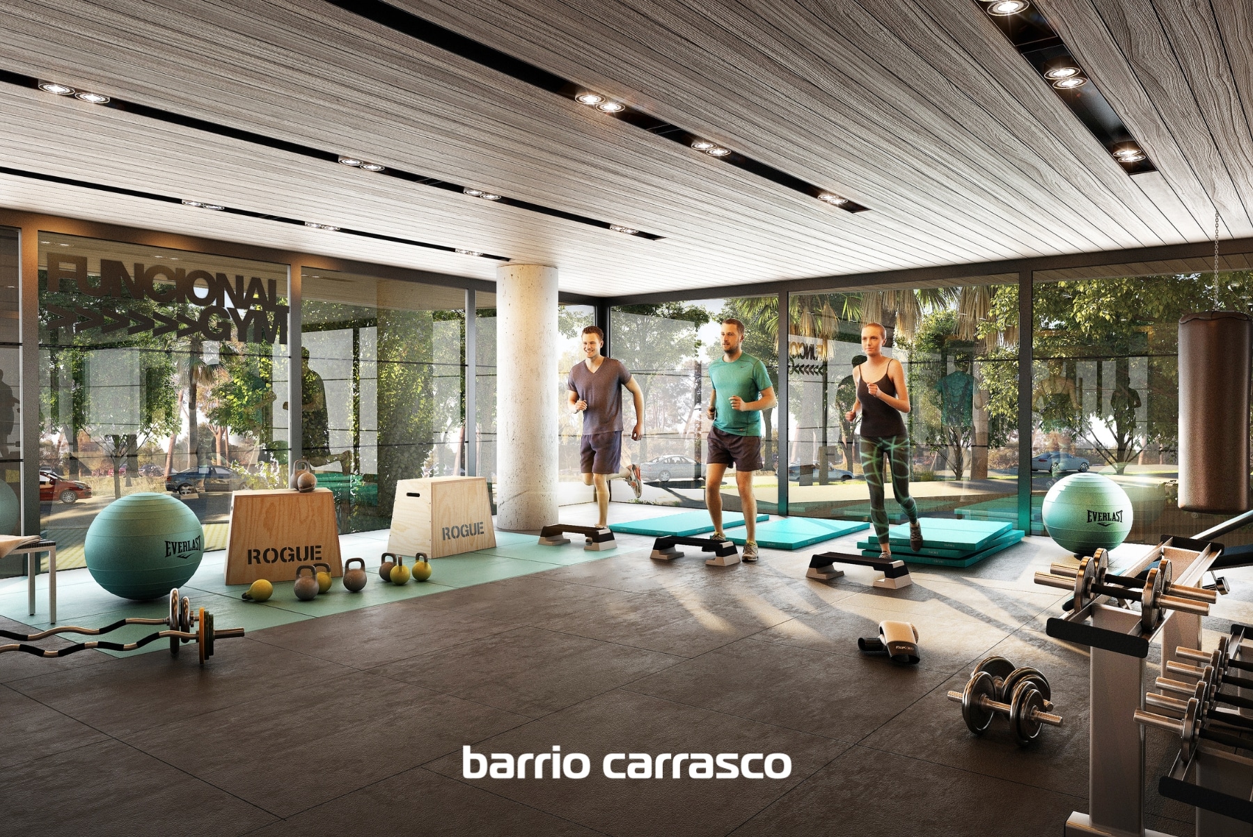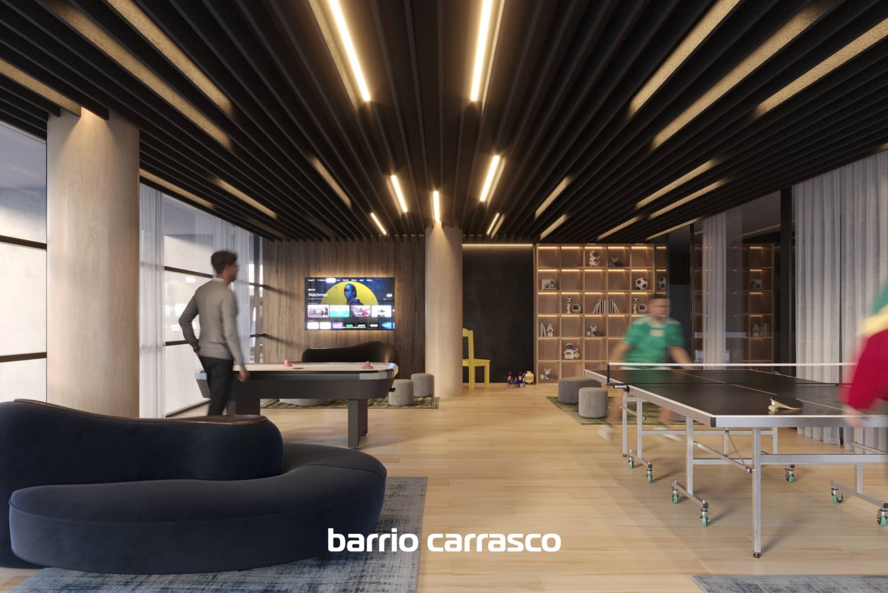 El proyecto integra piscina con solarium, rooftop bar, barbacoas, salón para eventos, playroom, Kids’ Club, functional gym, salón de belleza, parque lineal y áreas verdes, configurando un sistema de bienestar y recreación tanto interior como exterior.